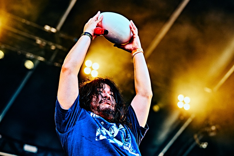 そこでステージに出てきたのはDANGER x FUTOSHI。その編成でライブを続けようとしたのだが、京都大作戦はバックヤードの食べものもうまくて、ダイスケはんは「食べ過ぎて、つい、お腹がポコッと」なんてこぼれ話も。いや、待て。その“ポコ”という言葉に身体が反応してしまうのが、マキシマムザ亮君である。「ポコペン ポコペン・・・ ダーレガツツイタ・・・」(註:ドラゴンボールのピッコロ大魔王ネタ ※詳しくはホルモンYouTubeを参照)と声を発するマキシマムザ亮君。ピッコロ大魔王よろしく、口から卵が生まれるらしい。恥ずかしがってこの場で卵は生まなかったが、実はすでに生んでいたという。