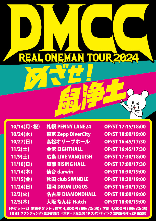 そして、アルバムのリリースに伴い、約1年半ぶりとなる待望の全国ワンマンツアー<DMCC REAL ONEMAN TOUR 2024 -めざせ!鼠浄土->の開催も決定。アルバムにもある「鼠浄土」というワードがこちらにも散りばめられており、鼠浄土を目指すべく全国11か所を回るツアーになっている。