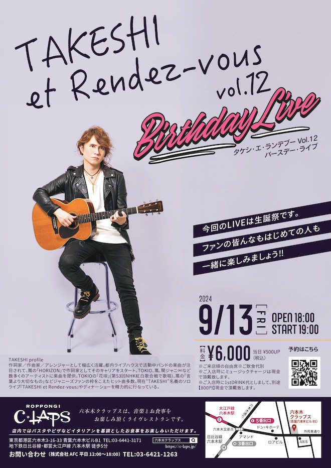 作詞家/作曲家/アレンジャーとして活動するTAKESHIが、9月13日にバースデーライブ<タケシ・エ・ランデブー vol.12>を開催する。詳細は以下の画像にて。