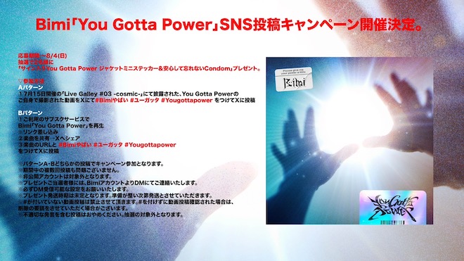 また、本日EP『Snack Box』より、「You Gotta Power(ヨミ:ユー・ガッタ・パワー)」が先行配信された。Bimiらしさ全開の最新パーティーチューンで、ライブパフォーマンスを想定したアッパーな4つ打ちビートに対して、Bimiとオーディエンスの一体感をイメージしながら制作された、おもわず踊りたくなる楽曲となっている。