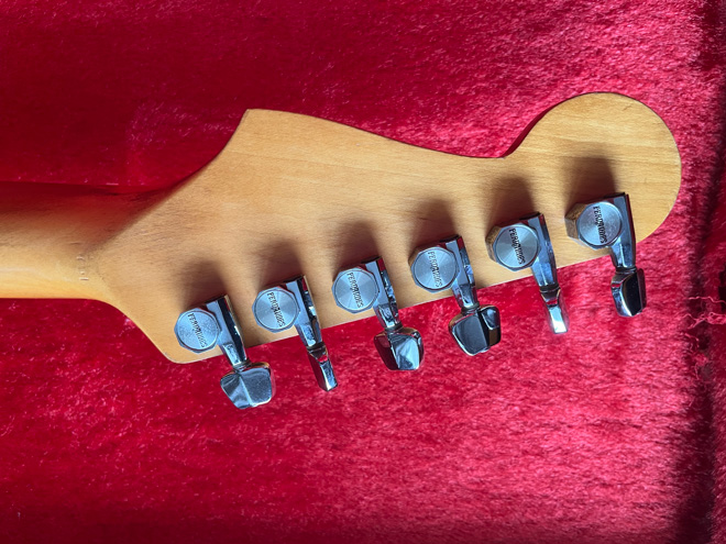 神奈川同士でふたりのギター好きが繋がったようで、なんだか嬉しい。フェルのストラト・タイプといえば、私の記憶によると、CBSロゴ風が最初で、その後にスパロゴ風が出てきたんじゃなかったかな。最初の頃はラージヘッドでもスモールヘッドでもCBSロゴ風のフェルロゴが使われていた気がします。もっと行っちゃえば、1970年代中期頃までは多くのストラトコピーはラージヘッドばかりで、いわゆるヴィンテージストラトの高品質コピーが登場し始めたのはトーカイのSTシリーズあたりだったのではないかな。私はこのペグを見て懐かしいーと思いました。学生の私は、フェンダーよりもペグがカッコいいじゃんと思っていたものです。(BARKS 烏丸哲也)