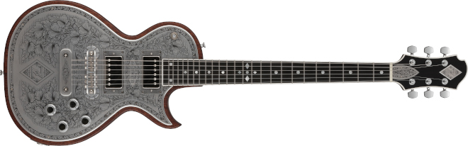 「MFG-AC-24 Diamond & Z」は、。ブリッジ後方に「Diamond & Z」彫金デザインを採り入れたモデル。「ヘッドに取り付けているダイアモンド・エンブレムを、メタル・ピックガードのデザインに採り入れてみてはどうか?」という発想が元になり生まれたデザイン。