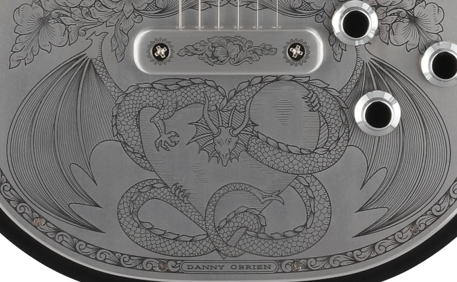 「MFG-AC-24 Dragon & Heart」は、ブリッジ後方に「Dragon & Heart」彫金デザインを採り入れたモデル。「ドラゴン」と「ハート」という別々のモチーフを昔の映画のタイトルからヒントを得て、組み合わせて生まれたデザインだ。
