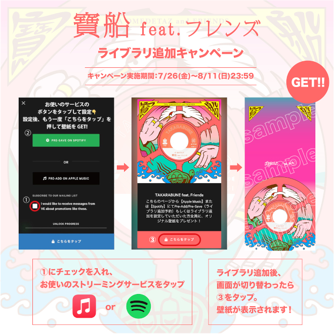 また、「寶船 feat. フレンズ」のライブラリ追加キャンペーンも開始となった。Apple MusicもしくはSpotifyにて「寶船 feat. フレンズ」を対象ページのURLからライブラリ追加すれば全員にオリジナルスマホ壁紙がプレゼントされる。