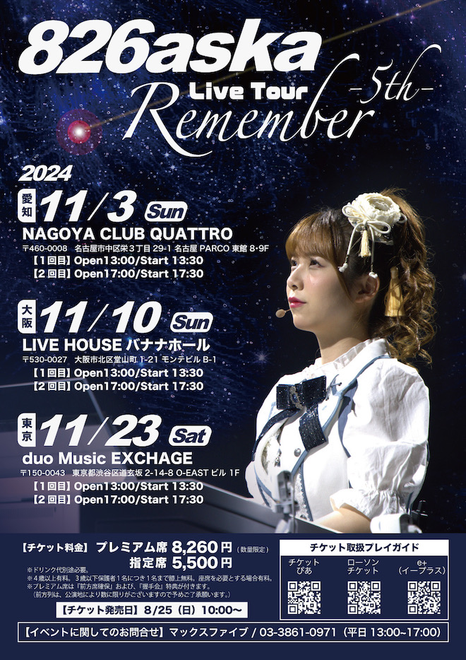なお、<826aska Live Tour Remember -5th->は全公演、プレミアム席と指定席に分かれている。プレミアム席の特典は、前方席の確保、本人との握手となっている。