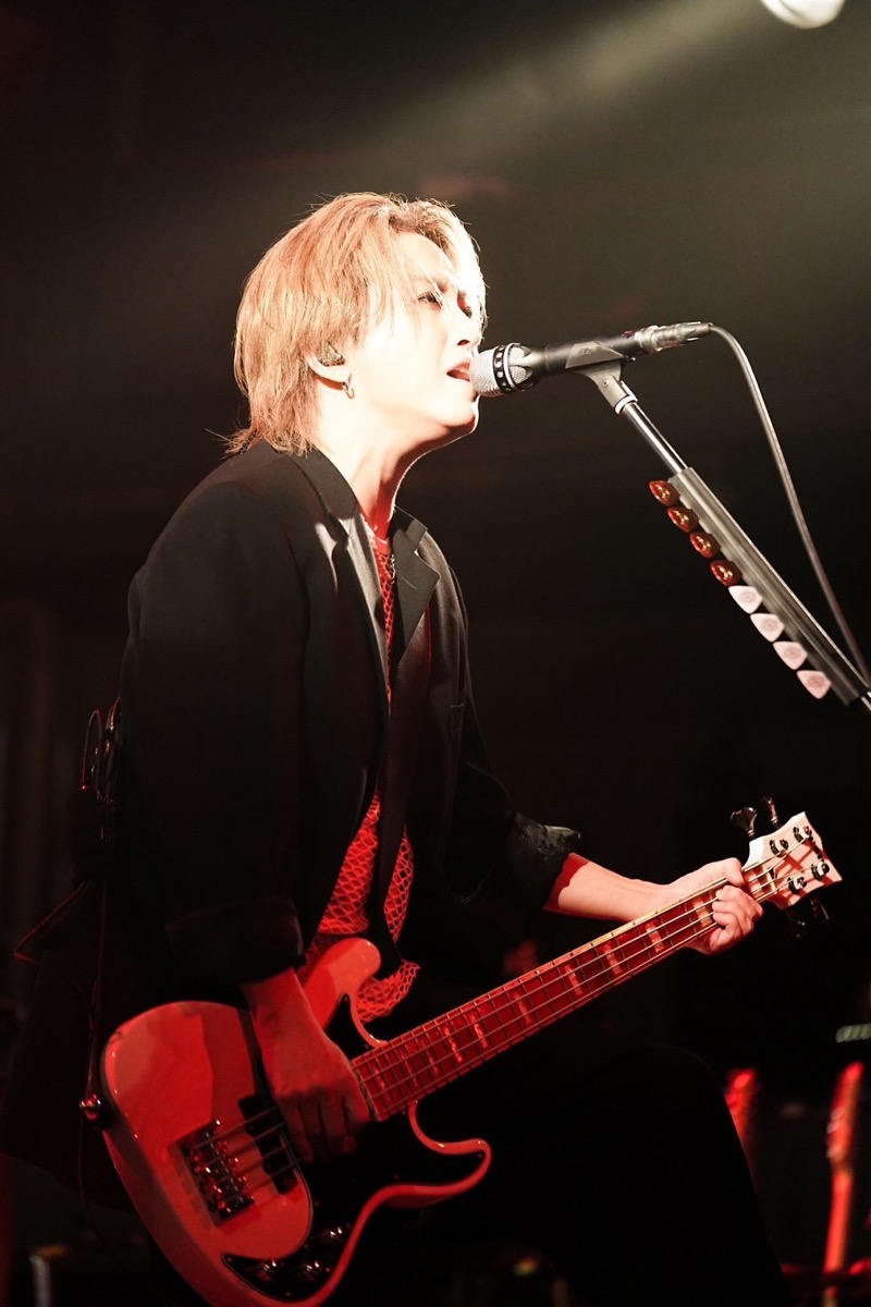 フロアの照明が落ちてSEが鳴ると、仄暗いステージに一人現れたAKi(Vo, B)。そのシルエットに黄色い声援が上がる中、SEに乗せて野太いベースサウンドを響かせ、音だけで自身の存在を証明した。続いて、メンバーがステージに登場すると、両耳に手を当てて湧き上がる歓声を浴びる。高々とベースを掲げてイントロが流れ、始まったOPナンバーは最新アルバムの1曲目でもある「Devotion」だ。AKiの憂いある歌声と、一音一音確認し合うように丁寧に力強く鳴らされるバンドサウンドは、“Devotion=深い愛”を意味するこの曲で、1曲目から観客を楽曲世界へとグッと引き込んでいく。