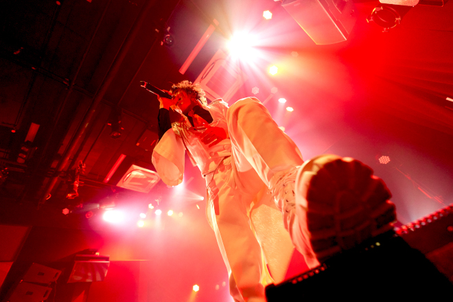 赤と黒に一瞬点滅する照明と共に妖しい笑い声が木霊する。ジャジーなロックサウンドを背に、掴めない表情をしたVALSHE。まるでその場を掌握するようなパフォーマンスでファンを魅了した。