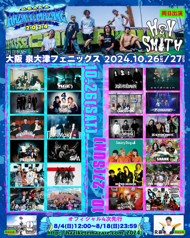 10月26日・27日に大阪・泉大津フェニックスにて開催されるHEY-SMITH主催フェス<OSAKA HAZIKETEMAZARE FESTIVAL 2024>のタイムテーブルが発表された。