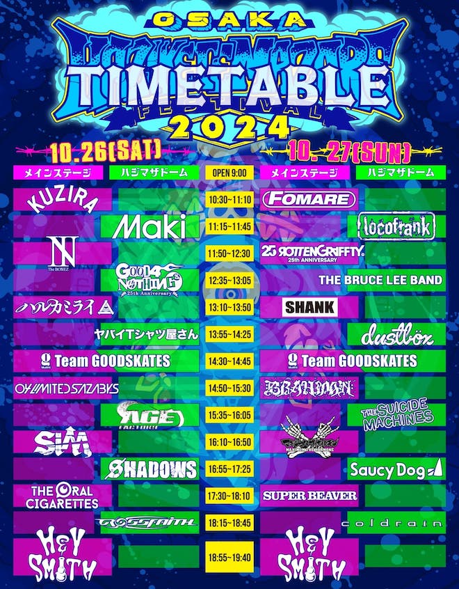 初日となる10月26日はKUZIRAからスタートし、04 Limited Sazabys、SiM・THE ORAL CIGARETTS、2日目となる10月27日にはアメリカからThe Suicide Machines、マキシマム ザ ホルモン、SUPER BEAVER、各日の大トリとなる主催のHEY-SMITHまで、2日間全バンド被りなしのタイムテーブルとなった。