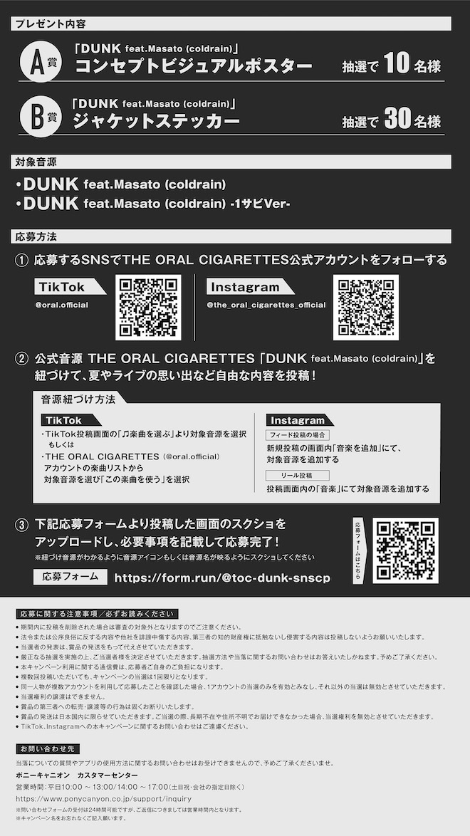 さらに、「DUNK feat.Masato (coldrain)」の配信を記念してSNS投稿キャンペーンの開催が決定した。本楽曲を使って、TikTokまたはInstagramで投稿すると、抽選で40名にオリジナル賞品がプレゼントされる。