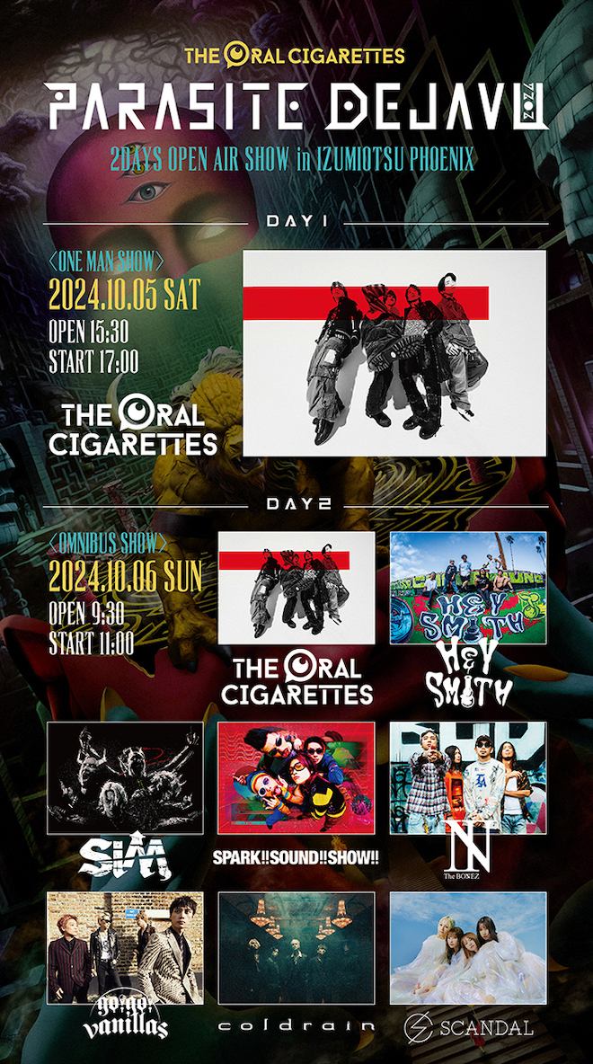 THE ORAL CIGARETTESが10月5日・6日に大阪・泉大津フェニックスにて主催イベント<PARASITE DEJAVU 2024 〜2DAYS OPEN AIR SHOW in IZUMIOTSU PHOENIX〜>を開催。DAY2はオムニバス形式のイベントとして開催されるが、本日最終出演者としてSCANDALが発表された。