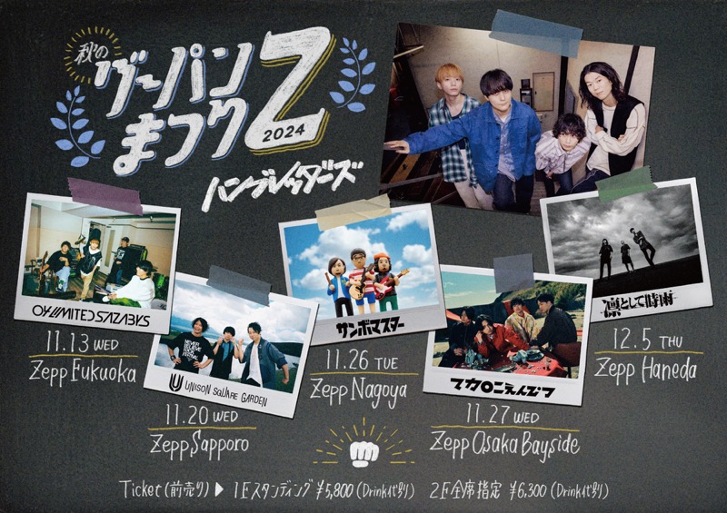 このたび明らかになったゲストアーティストは、Zepp Fukuoka公演に04 Limited Sazabys、Zepp Sapporo公演にUNISON SQUARE GARDEN、Zepp Nagoya公演にサンボマスター、Zepp Osaka Bayside公演にマカロニえんぴつ、Zepp Haneda公演に凛として時雨。ハンブレッダーズのメンバーが尊敬する先輩や同世代など、珠玉のロックバンドばかりが出揃った。チケットの各バンドオフィシャル先行予約受付は本日8月12日21:00から。