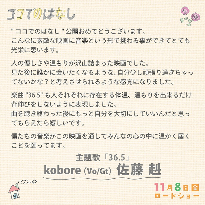 kobore、映画『ココでのはなし』の主題歌に書き下ろし楽曲「36.5」が決定