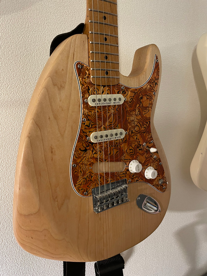 タモ材とは違った光り方をするメイプル材。硬すぎて加工に苦戦しましたが、芯のある出音に惚れ惚れ。(工具はいくつか負けました)