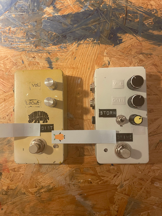 ストラトの抜けた音も大好きですが、絞っても埋もれすぎないハーフムーンキャスター。オールドなエフェクターが似合うと考え、そちらも制作しました。雑味のあるTS系と、暖かい音色のディストーションです。