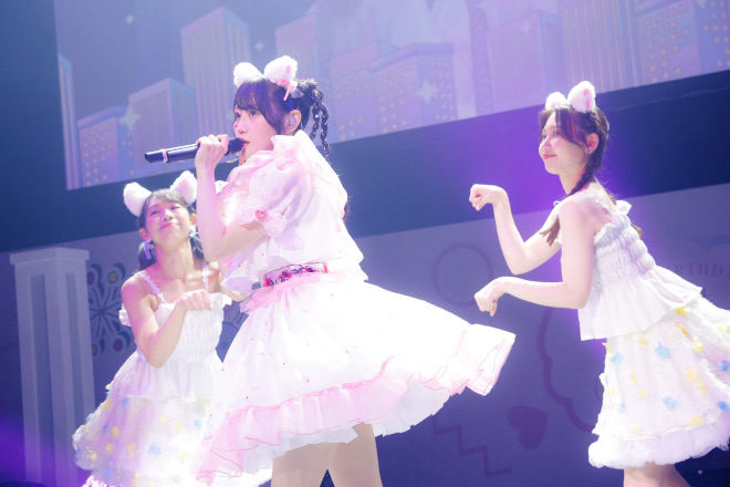 待望のライブコーナーでは、浴衣姿からピンクをあしらったキュートな歌衣装にチェンジ。「君色のキセキ」「I・LOVE・YOU!!」を立て続けに披露した後は、今回のイベントのテーマ“Day Cute mode”にあった曲として「ね〜え?」(松浦亜弥)と「最上級にかわいいの!」(超ときめき♡宣伝部)をカバー。ダンサー2人も加わって、会場をさらに盛り上げていく。そして、ラストスパートとばかりに、猫耳をつけてかわいさマシマシで「Wild☆Kitty」、「ハイタッチ☆メモリー」を熱唱し、ライブコーナーを締めくくった。