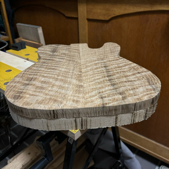 前回同様、f字ホールを両サイドに配しています。今回はネックも自作。柾目のチェスナットが手に入ったのと、以前から所有していたブビンガを指板に使いたかったので。