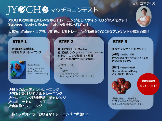 JYOCHOは新曲のリリースを受け、「Strong Body and Rich Future of Macho Minimal Fairy」のタイトルになぞらえた<JYOCHOマッチョコンテスト>の開催を発表。人気筋トレYouTuberのコアラ小嵐とコラボレーションしたSNSキャンペーンで、参加者の中から抽選で1名にJYOCHOとコアラ小嵐のサイン入りTシャツ、10名にはジャケットに描かれたマッチョミニマル妖精のアクリルキーホルダーがプレゼントされる。