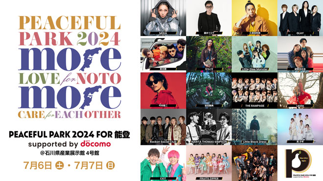 7月6日・7日に石川県産業展示館で開催された能登半島地震復興支援ライブ<PEACEFUL PARK 2024 for 能登 -supported by NTT docomo->の映像が、9月1日より1ヶ月の期間限定で配信される。