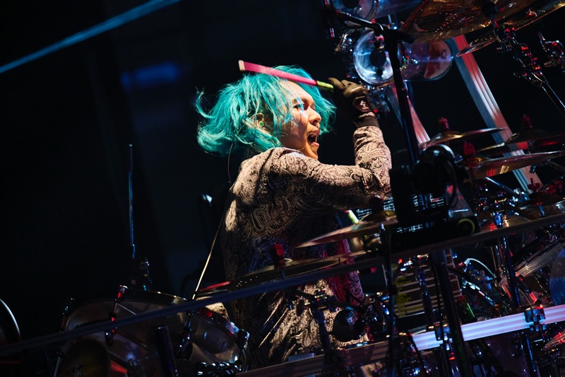 15分のインターミッションを経て、DEAD CAN DANCEの「De Profundis (Out of the Depths of Sorrow)」に乗せ真矢が姿を現した。真矢が位置に着くと明滅していたステージライトが消え、代わりにドラムセットが緑色に発光し、やはり呼吸のような自然さで明滅した。一打振り下ろすたびに観客の「真矢!」という叫び声を求め、「もっとこいや!」と煽っては互いに昂っていく、お馴染みのコール&レスポンス。「ハーッ!」という真矢の一声で特効が爆ぜたのを合図に、4人がステージに戻ってきて「FATE」へ。怒涛の盛り上がりで、5人揃っての第二部はスタートした。