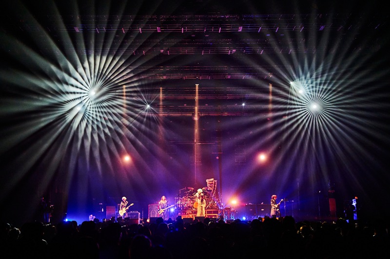 ブルーと白のレーザー光線がひんやりとした月夜を思わせる舞台へと、メンバーが再登場。アンコールで披露したのは、ミステリアスな大曲「MOON」だった。本編ラストの熱狂が遥か昔のことのように思えてくる幻想空間が広がっていく。ゆったりとしたテンポ感の中で、悠然とした歌唱と演奏を積み重ねることで昂っていく、熟練の表現に感嘆するばかりだった。ミラーボールが無数の光の筋を放射する中、メンバーは再度ステージを後にした。