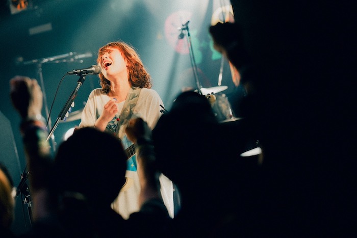 音やメロディだけでなく心と心でつながるような濃密な時間を経て、ここからライブはさらに高らかに飛び上がっていく。〈ファジーネーブルの匂いで/私どこかに行けそう〉と一節歌った紬衣が「Crest、いける?」とフロアに尋ねる。もちろんオーディエンスは準備万端、「ファジーネーブル」がバンドとみんなのつながりを証明するように鳴り響く。最後のサビを前に「頼んだ!」とフロアに歌を任せる紬衣。その声に応えるように、大きなシンガロングが巻き起こったのだった。