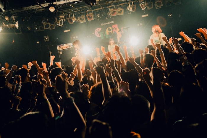 さらに「baby blue eyes」に「プードル」と楽曲を力強く畳み掛けていくConton Candy。彩楓の歌うようなドラミングに、フロアを見渡しながら楽しそうにベースを弾く楓華。その上で伸びやかに広がる紬衣の歌は、どこか危うさも感じさせながら、自らその危うさを振り切るように突き抜けていく。とても明るくてパワフルなのに、同時に切迫感を感じさせるような彼女の声はいったいなんなのだろう。メンバーはもちろん、オーディエンスの手拍子や声までもがひとつになってその声を盛り立て、支え、後押ししていく。まだまだ序盤だが、O-Crestには最高の一体感が生まれている。