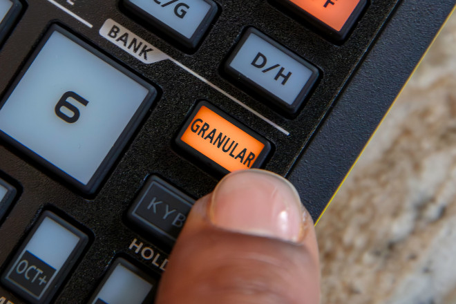 『P-6』に搭載されたグラニュラー・サンプラー機能は、サンプルをごく短い時間に分割したグレイン=「音の粒」を使って、新たなサウンドを作れる。グレインのサイズや再生位置を変えたり、グレインの数を増やしたり、グレインの再生方向や定位(パン)などをランダムに変化させるなどの処理を行い、元の音のイメージを変えることが可能。『P-6』は、あらかじめサンプリングしたサンプルから、グラニュラー・サンプラーで音を作ることができる。