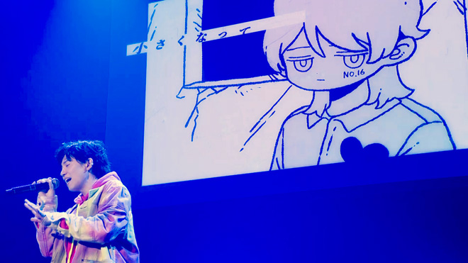 いよいよ本編クライマックスを飾るライブコーナーへ。披露されたのは、アーティストとしての新しい方向性を最初に示した「ヒトコキュウノ」である。“かもみら”がイラストを、“えむめろ”が編集をしたMVをバックに、ファンタジックで幻想的な世界観を表情豊かに描き出していく。続いて、yama「春を告げる」のサウンドプロデューサーとしても知られる”くじら”によるシティポップナンバー「キャンドル」を歌唱。客席に黄色い光が灯る。この曲でも、ヨルシカ作品など多くのアニメーションMVを手掛けている”大鳥”によるイラストが描かれたリリックビデオが映し出される。視覚と聴覚の両方で、その世界へと引き込んでいった2曲を経て、本編最後に、8月30日にリリースされたばかりの最新曲「プラシー」をプレゼント。「プラシー」は、「小さい頃に大切にしていたぬいぐるみにもしも感情があったなら」という視点から、ササノマリイが描いた大人のファンタジーソング。〈覚えてる? 君が 僕の手を握って いつだって 一緒にいたの君と見た景色 〉という一節では、まるで隣に「君」がいるように歌い、それまで片手で握っていたマイクをところどころ両手で握る。屈託のないまっすぐでピュアな歌声とオルゴールのような優しい音色が、心のやわらかい部分を刺激する。曲が終わると温かな拍手と歓声が、会場を包みこんだのだった。