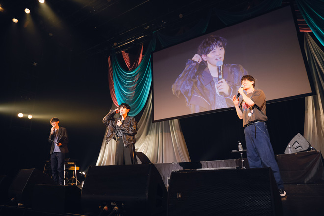 話題は尽きないものの、畠中と浜田は一度バックステージへと戻り、次のライブパートへ。山下はステージに準備されていた楽器について触れ「すでに気づいていた方もいたかもしれませんが、下手(しもて)にキーボード、上手(かみて)にギターがございます。ここからはアコースティックコーナーです」と、白井アキト(key)、二木 元太郎(G)をステージに招いた。「本当にね、この2人は素敵なの。リハの段階から耳が幸せになるような演奏をしてくれるんですよ」と興奮気味に紹介した。