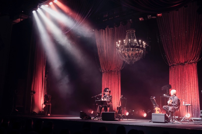 サポートを務めるJOHN (G)と共に、アコースティックギターと歌のみというシンプルな編成によって、KIRITOの全キャリアの中から選曲されたメニューを展開していくのが<Phantom>公演のスタイルだ。中央には巨大なシャンデリア、左右にはビーズカーテンが柱のように位置する舞台に、KIRITOがオールブラックの装いで登場。「Enter the NEOPHASE」(Angelo)での幕開けから「CRUELWORLD」(Angelo)に至るまで全18曲の濃密なステージを繰り広げた。