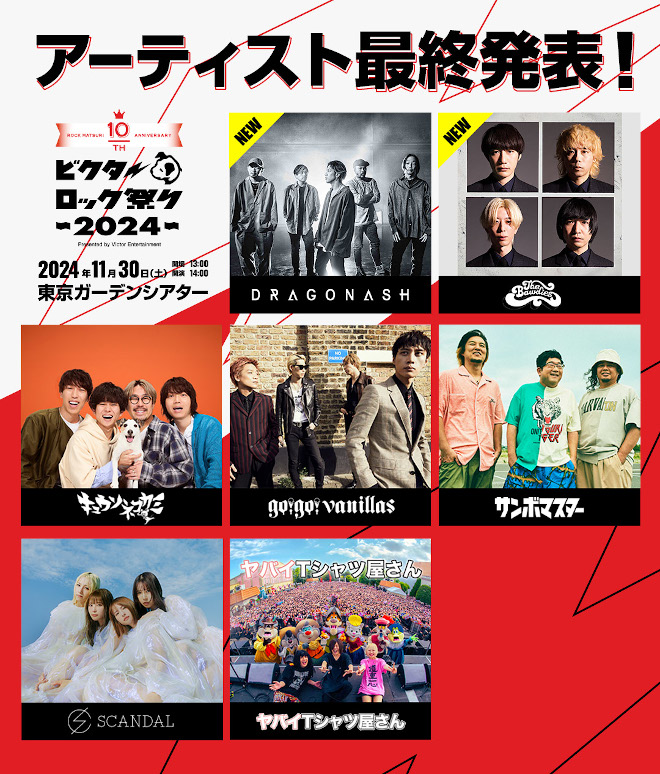 <ビクターロック祭り2024>が、11月30日(土)に東京ガーデンシアターで開催。出演アーティストの最終発表があり、THE BAWDIES、Dragon Ashの2組の出演が決まった。