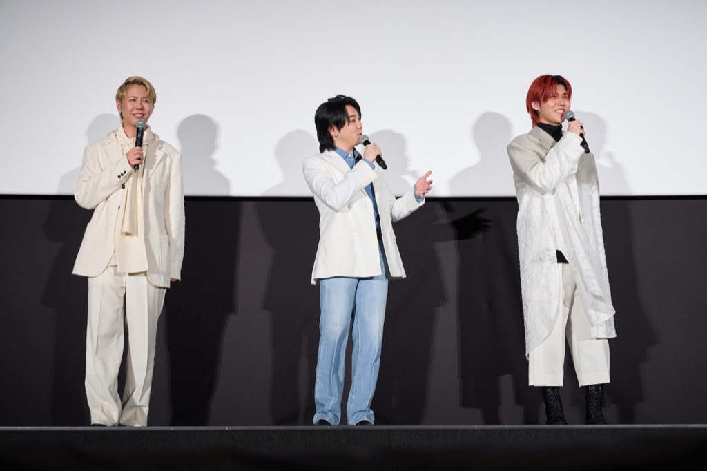 アンコール舞台挨拶あらため、大ヒット御礼舞台挨拶となった9月22日。「ケセラセラ」の音楽が流れる中、丸の内ピカデリーのスクリーンの前に立ったのは、Mrs. GREEN APPLEの大森元貴、若井滉斗、藤澤涼架。大森は「皆さん、こんにちは! 元気にしてますか?」と笑顔で挨拶。若井は「短い時間ですが楽しい時間を過ごせたらと思います」、藤澤も「(映画を)見終わった後ということで、内容も踏まえたトークができたら!」と続き、いつもの仲の良い雰囲気を醸し出していた。