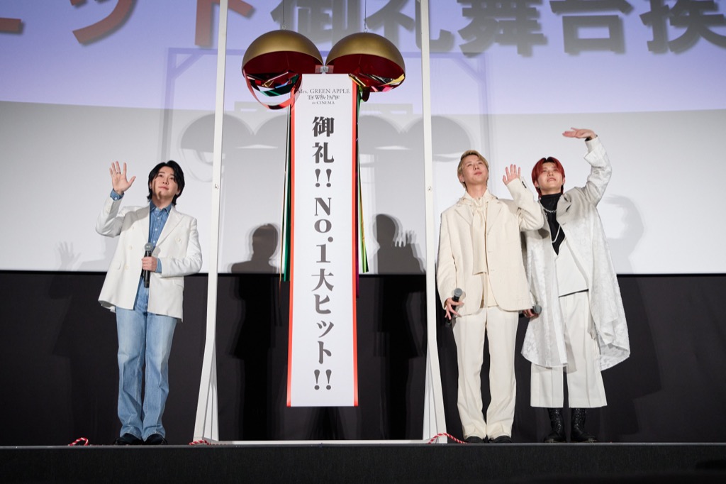 Mrs. GREEN APPLE初の音楽劇として行われたライブツアー<Mrs. GREEN APPLE 2023−2024 FC TOUR “The White Lounge”>を映画化した『Mrs. GREEN APPLE // The White Lounge ㏌ CINEMA』が、現在ヒット中だ。この快進撃を祝い、9月22日(日)、東京・丸の内ピカデリー1にて舞台挨拶が行われた。