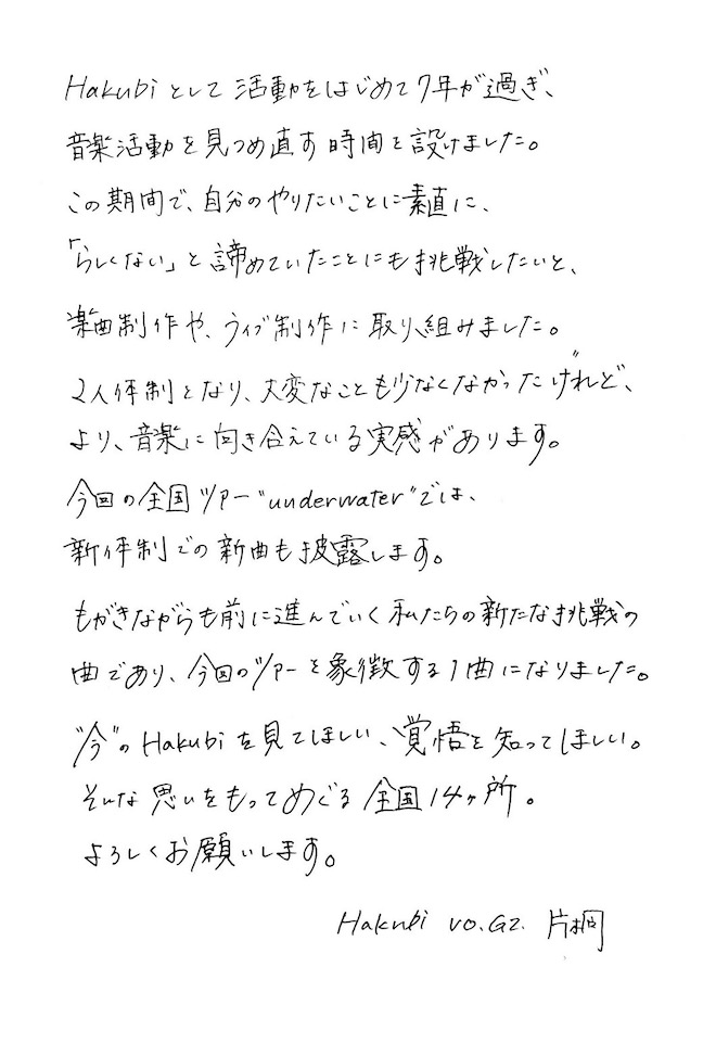 初日公演は、ドラムとギターをサポートに迎え、Hakubi史上初の4人編成でのライブとなる。新体制後初となる新曲の披露も予定しており、「もがきながらも前に進んでいく私たちの新たな挑戦の曲であり、今回のツアーを象徴する1曲」とのこと。片桐 (Vo, G) からの今回のツアーに懸ける想いを綴ったコメントも寄せられている。