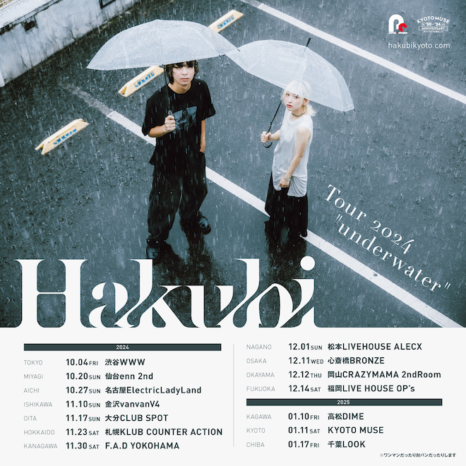 また10月4日には、渋谷WWWにて全国ツアー<Hakubi Tour 2024 “underwater”>の初日公演が開催される。チケットは9月28日午前10時より一般発売がスタート。なお同日昼に同会場にて開催されるフリーライブは応募多数により既に受付終了している。