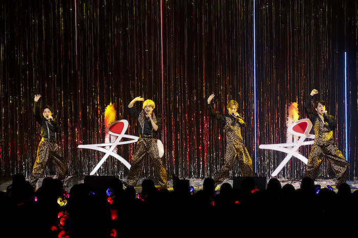 カラフルなジュークボックスのようなセットの中、ヒョウ柄スーツで登場した4人はしょっぱな「君じゃなきゃだめなんだ」をパフォーマンス。しっとりと歌い上げ、曲終わりに全員が集まり手を掲げ、掲げた手を組むポーズも新生グループの決意を感じさせる。