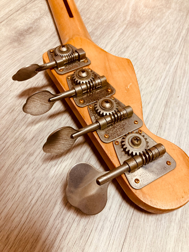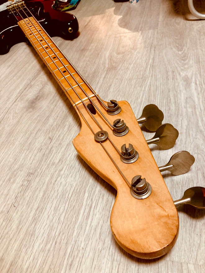 本当はシドビシャスばりの白いプレベを探していたんですが、こちらはサンバーストに鼈甲ピックガードという渋めのデザイン。しかしこの楽器屋のオヤジの、預かり受けた楽器のネジは全てゴールドに交換するという謎のこだわりにビッときて即購入。2万円也。