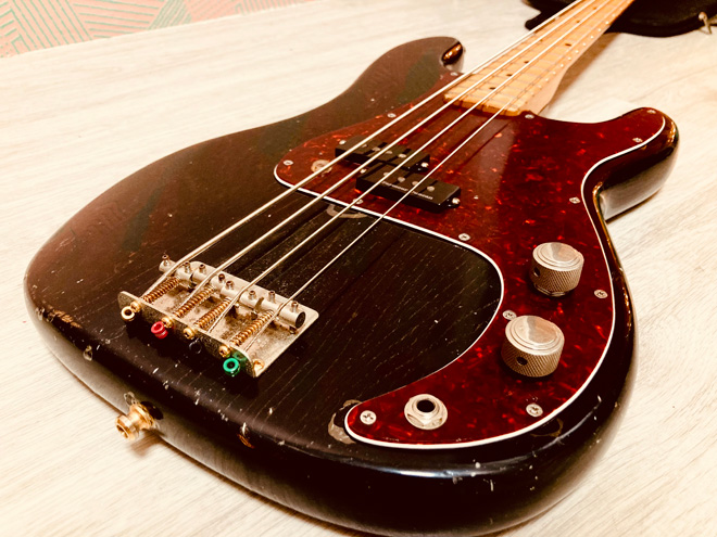 彼との付き合いもはや23年となりますが、その間にも、怒り狂った彼女に破壊されたり、長野のヒッピーフェスに出演した際は、酔い潰れたオーナーに、朝までほったらかされて朝露かぶったりと、なかなか可哀想な飼育のされ方したものですが、ボディの色塗り替えたり(その際ヘッドのロゴはヤスリで消えてます)、ピックアップ交換してみたり、プレベ定番の、パラレル→シリーズ切り替え改造施したりと、案外可愛がられながら今も現役バリバリで活躍中!