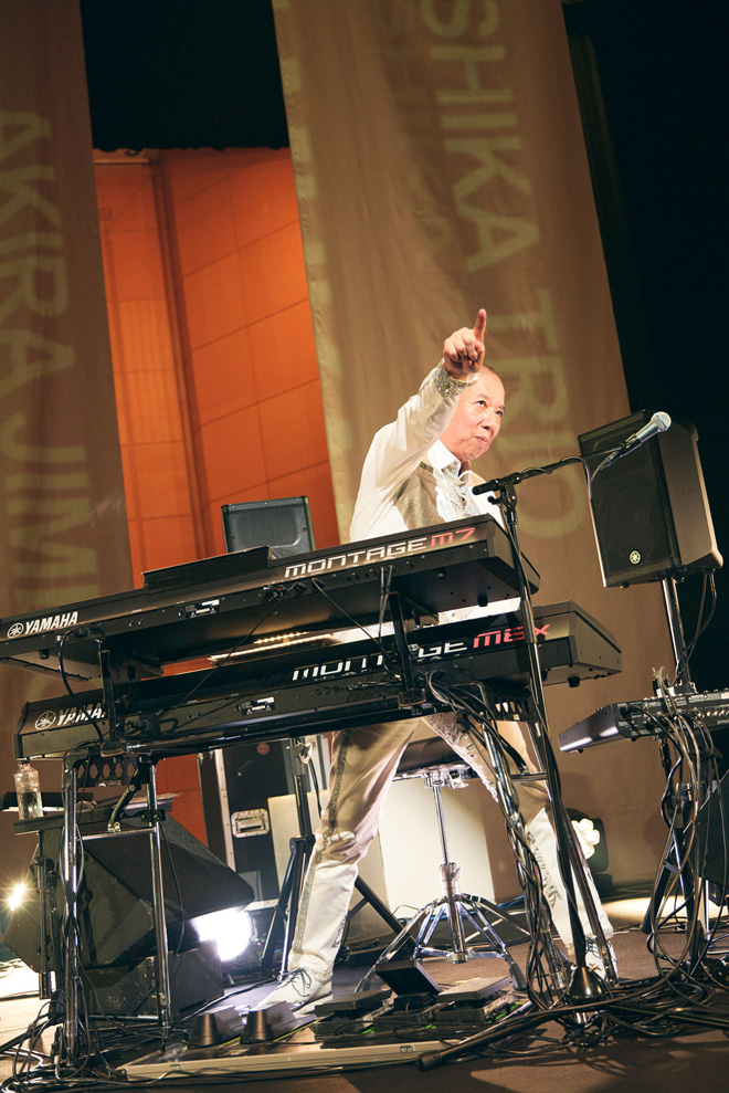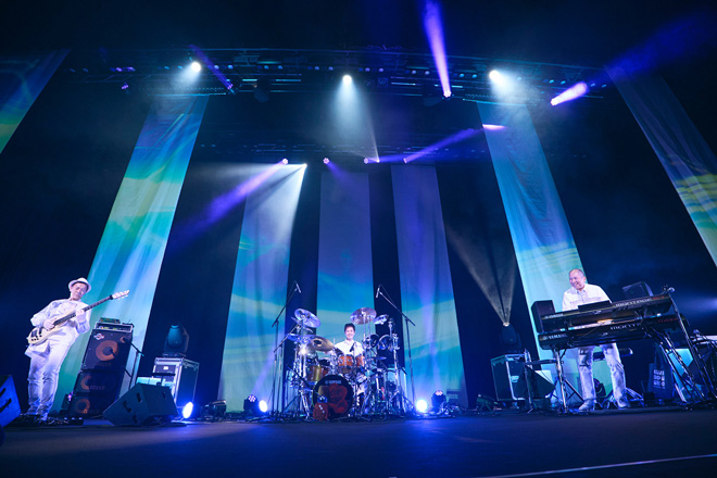 3人の生演奏を待ち望んだ往年のファンから若者まで1,300人のオーディエンスが集結、ツアータイトル通り、ステージ上はスペーシーな装飾と照明演出がなされ、この日のために新調した真っ白な衣装を纏ったメンバーが登場すると、大きな歓声が沸き起こった。「大人気ないオトナの音楽が宇宙へ飛び出す」というテーマ通り、演奏曲は超絶技巧を要する曲ばかり。それでも細かいパッセージも逃さない卓越したスキルとパワフルな演奏でオーディエンスを歓喜へと誘っていく。