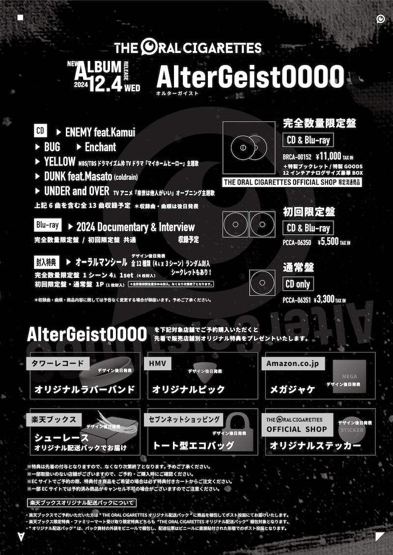 完全数量限定盤(THE ORAL CIGARETTES OFFICIAL SHOP限定流通商品)と初回限定盤には、「2024 Documentary & Interview」がBlu-rayで収録予定だ。CD収録曲などの詳細は追って発表予定だ。