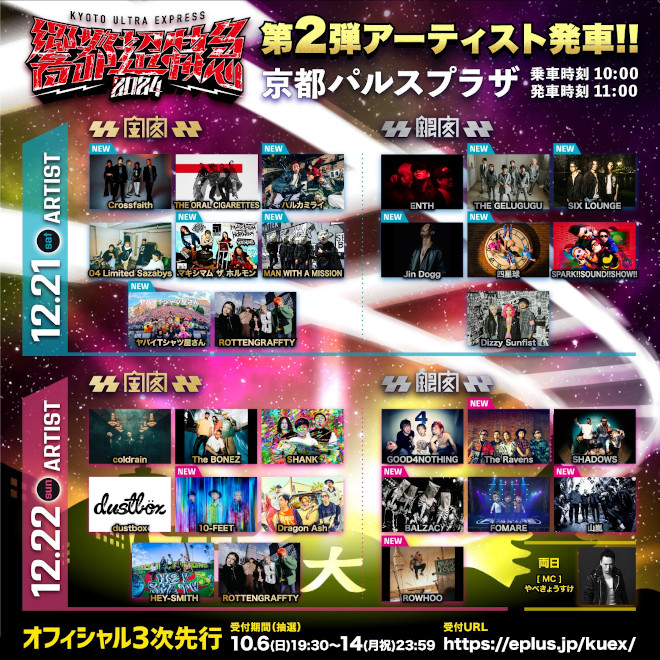 2024年は12月21日(土)・22日(日)の2日間、京都パルスプラザにて開催。発表になったのは、Crossfaith、10-FEET、ハルカミライ、マキシマム ザ ホルモン、MAN WITH A MISSION、ヤバイTシャツ屋さん、THE GELUGUGU、The Ravens、SIX LOUNGE、Jin Dogg、四星球、BALZAC、山嵐、ROWHOOの全14組。MCは両日やべきょうすけが務める。
