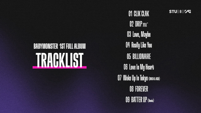 『DRIP』最初のトラックは「CLIK CLAK」で、ヤン·ヒョンソク総括プロデューサーは「YGでも見せたことのないオリジナリティが強いヒップホップ曲」と説明した。 7人のメンバー全員がラッパーとして出るBABYMONSTERの新しい音楽的試みでアルバムの最初の章を開く。