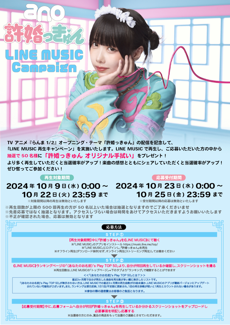 さらに、リリースを記念してLINE MUSIC再生キャンペーンの開催が決定した。応募者から抽選で50名に、ここでしか手に入らない“許婚っきゅん オリジナル手拭い”がプレゼントされる。詳しい概要は、ano STAFFオフィシャル Xアカウント(旧Twitter)にて。