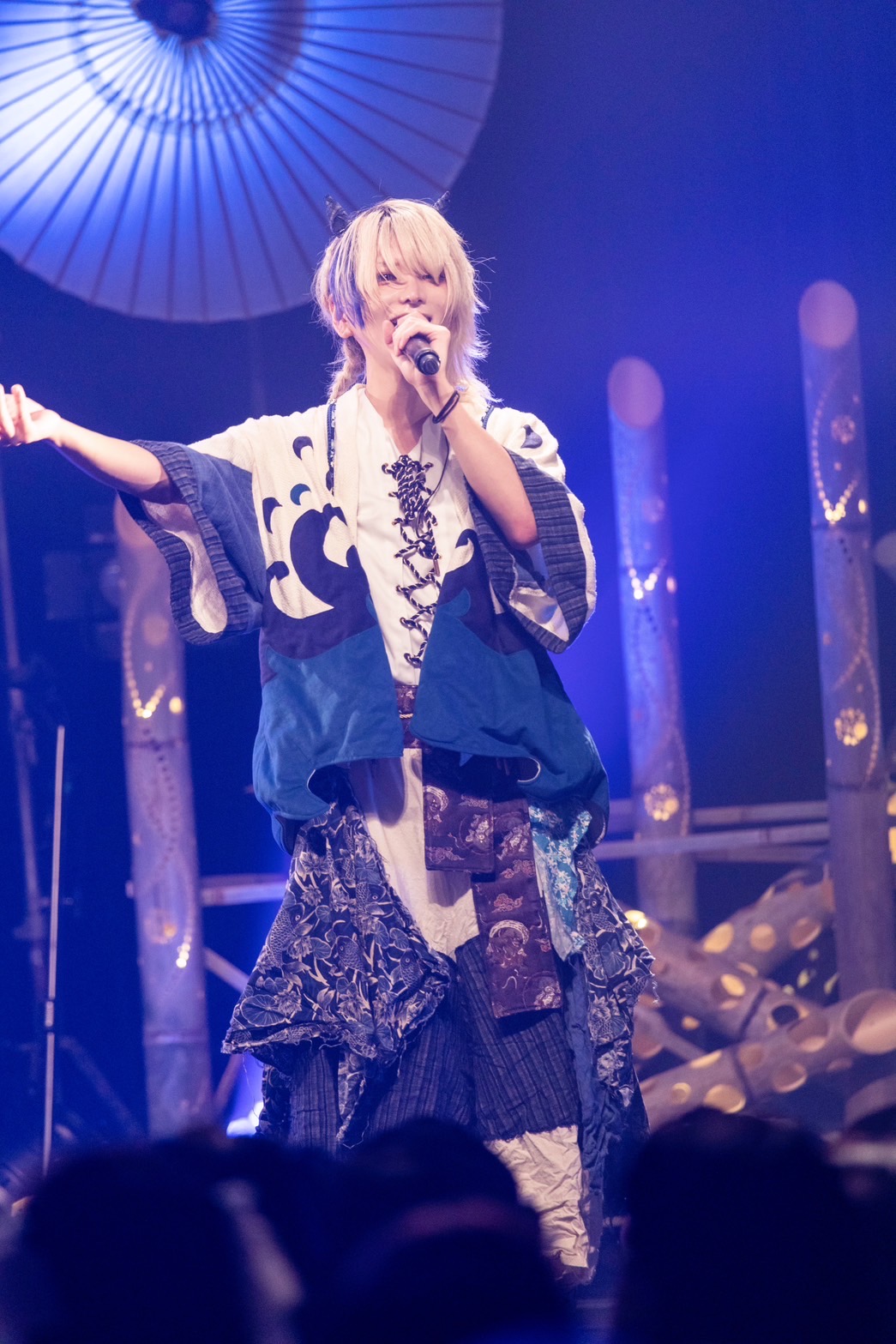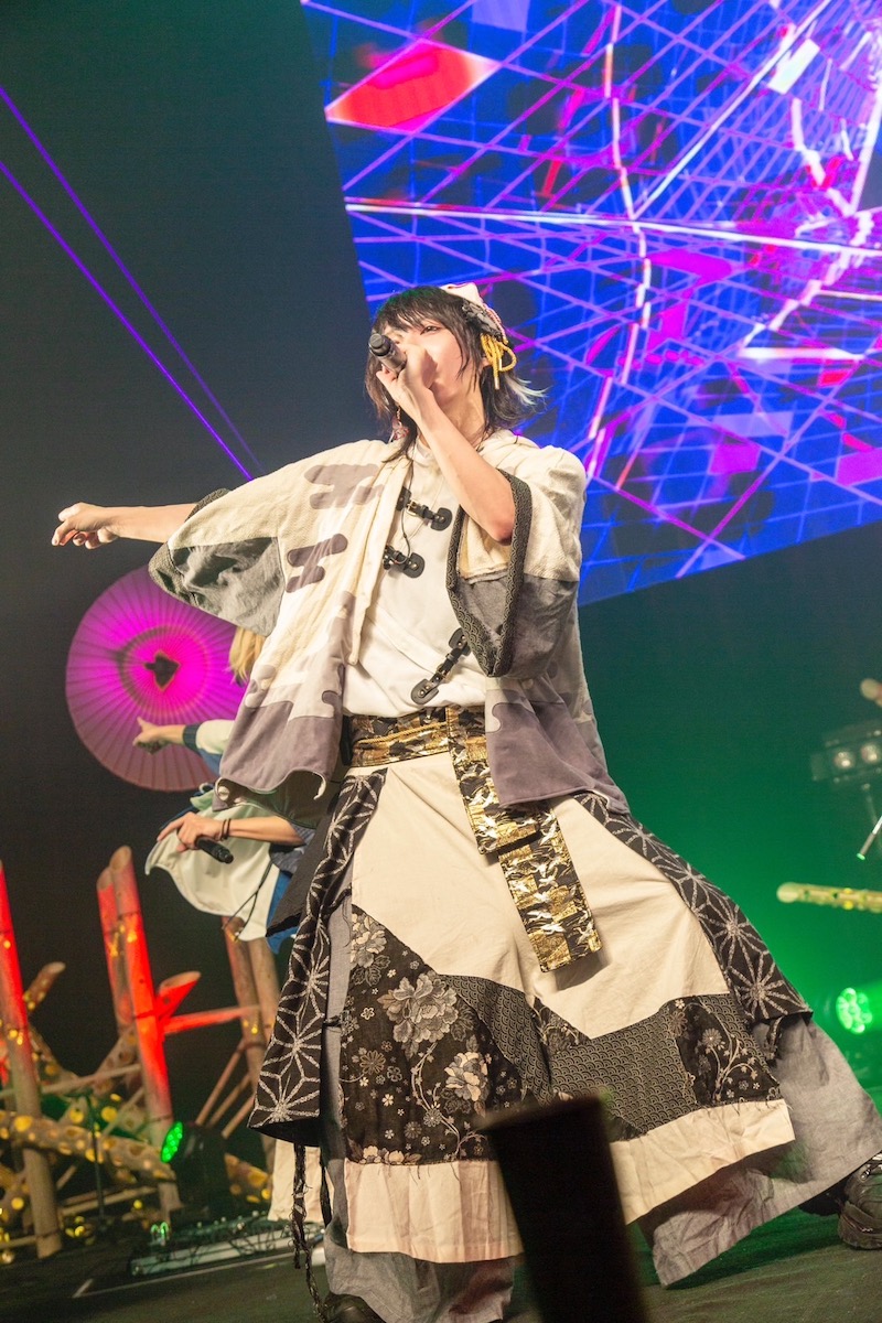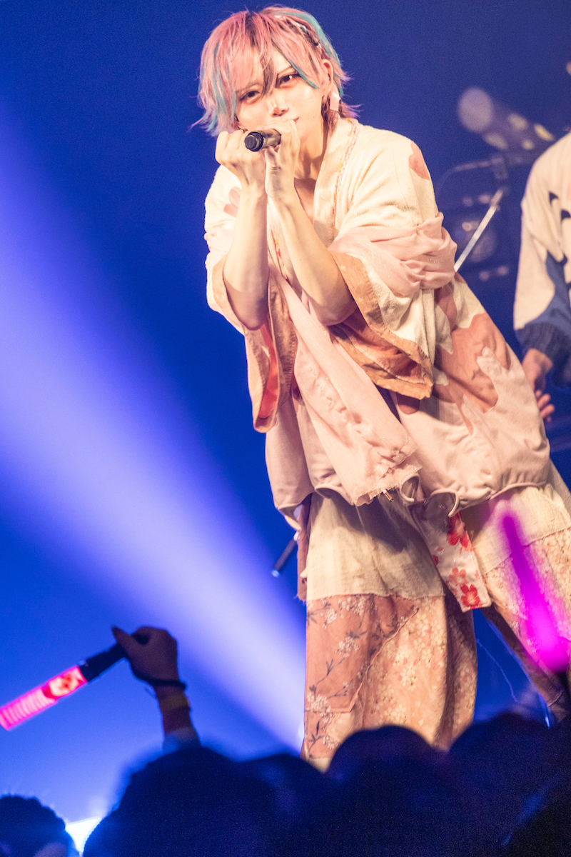 光を放つ竹と和傘が彩るステージでバックバンドが音を奏でる中、赤と青のスポットライトに照らされながらメンバーが登場。フロアでは色とりどりのペンライトが勢い良く回転し、「サクライロメモリー」から、この日のライブは始まった。初っ端の有り余る力と優しい歌声の対比が心地良く会場を包む。そこから元気いっぱいに「救済バタフライ」、しっとりとした始まりからテンポの良いサビへと展開していく「グリッターレイ」と、表情を変えながら、満員御礼の空間を盛り上げていった。