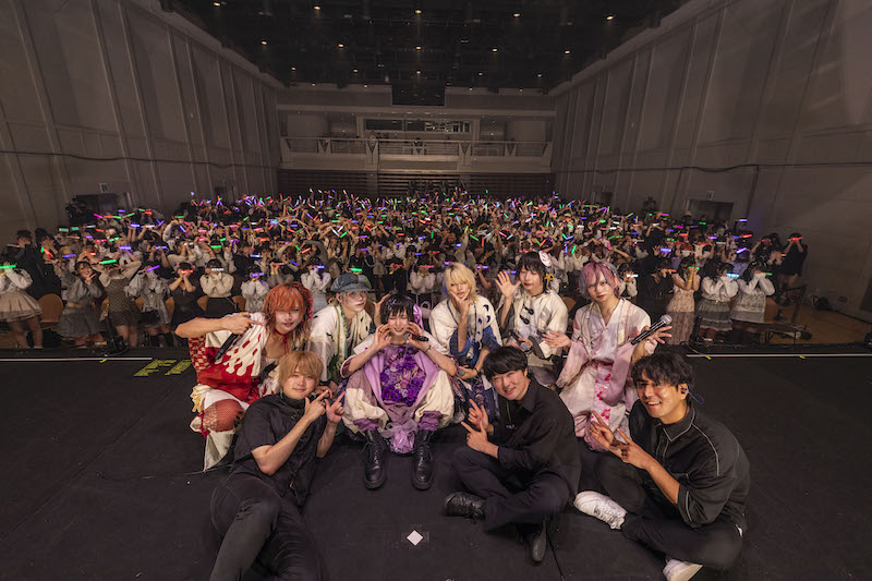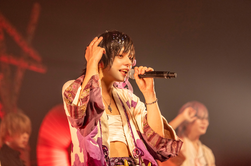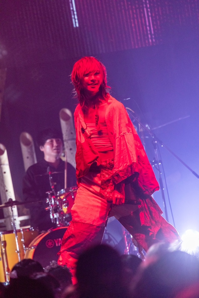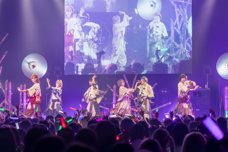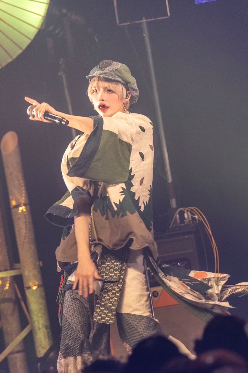 光を放つ竹と和傘が彩るステージでバックバンドが音を奏でる中、赤と青のスポットライトに照らされながらメンバーが登場。フロアでは色とりどりのペンライトが勢い良く回転し、「サクライロメモリー」から、この日のライブは始まった。初っ端の有り余る力と優しい歌声の対比が心地良く会場を包む。そこから元気いっぱいに「救済バタフライ」、しっとりとした始まりからテンポの良いサビへと展開していく「グリッターレイ」と、表情を変えながら、満員御礼の空間を盛り上げていった。