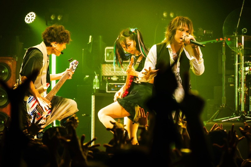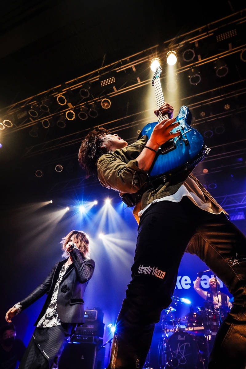 続く2曲目に披露したのは、L’Arc-en-Cielが1994年に発表した2ndアルバム『Tierra』収録曲「Inner Core」。リズムを中心に疾走感を増幅させながら各パートが複雑に絡まり合う展開が魅力的な、かなりレアな楽曲であり、こういう曲が今の解釈にきちんと落とし込まれたアレンジで演奏されるというのもLike-an-Angelの魅力のひとつだ。また同時に、この曲をなぜ披露したのかが後ほどこの日のライヴに起きる“事件”の大いなる伏線となっていたということも合わせて記しておく。