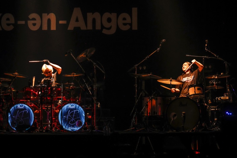 同曲終盤には、Sakuraとhibikiによるドラムバトルが実現。元L’Arc-en-Cielのメンバーと、Like-an-Angelのメンバーによる競演を、いったいどんな言葉で表現すればいいのだろう? 現実と空想の中間…そんな気分で、目の前の光景を見つめ、身体に突き刺さる音を受け止めていた。