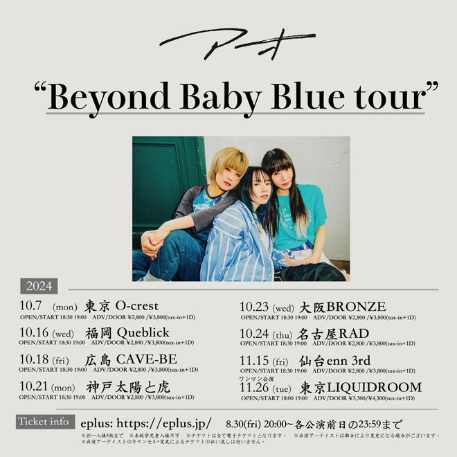 アオは全国8箇所を廻るツアー<Beyond Baby Blue tour>を敢行中で、ツアー初日となる10月7日渋谷Spotify O-Crestにて行われたアオの初ライブは見事ソールドアウトとなり、そのままツアーファイナルの11月26日恵比寿LIQUIDROOMワンマンライブまで駆け抜けることとなる。