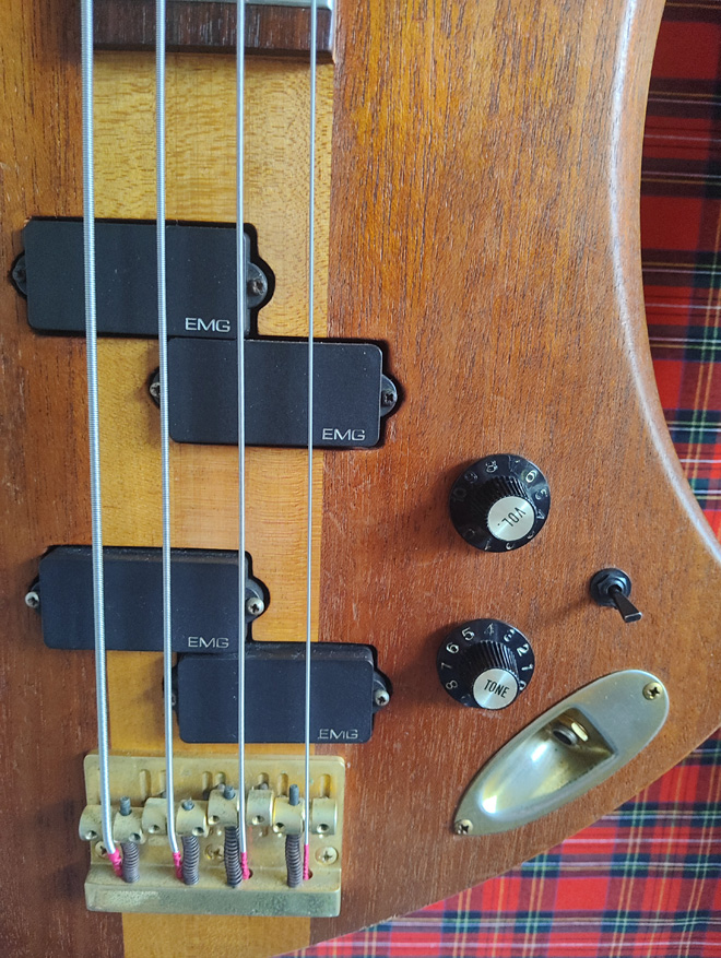 パーツ類は(おそらく)純正品をそのまま使い、良いこなれ感です。ピックアップは交換されてまさかの!EMG-Pを2発搭載!素敵すぎます。コントロールは1ボリューム1トーン。そしてバイパスによるフルテンスイッチと、元の仕様通りです。